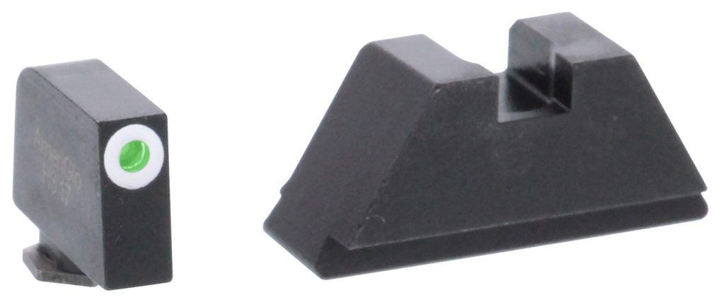 AmeriGlo brings a clear advantage to your shooting experience on and off the range. AmeriGlo Optic Compatible Sight Tall Suppressor Sights set provide a precise, elevated co-witness sight picture for slide-mounted red dot optics and suppressors and serve as reliable back-up sights. This XL Tall model has a green tritium front sight with white outline and flat black rear sight and black finish. It is compatible with all Glock Gen 1-5 models. Fits Glock MOS slide. Compatible with Aimpoint Acro, Holosun 509T, Steiner MPS footprints.