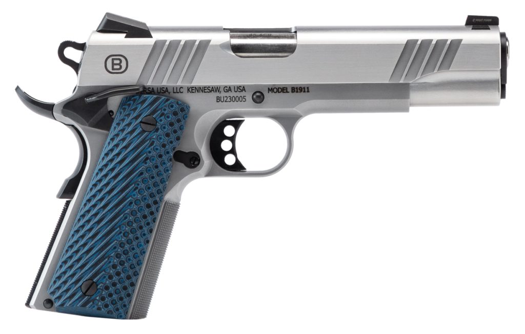 BERSA’s B1911 Blue Stainless edition is a fusion of classic design and modern sophistication. Crafted with precision from durable 416 brushed stainless steel this iconic pistol boasts a striking blue VZ Grips that set it apart from the crowd. With its timeless 1911 platform crisp single-action trigger and superior accuracy the BERSA 1911 Blue Stainless Steel is the perfect blend of style and performance for discerning shooters. – SKU B19117050SMBL – Action SAO – Trigger Pull 3.5 lbs – Caliber .45 AUTO – Capacity 8+1 – Frame Material 416 Stainless Steel – Frame Size Full Size – Front Sight Tritium Night Sight – Rear Sight Notched-Bar Dovetail – Safety Grip Safety – Height 5.5 in – Series B1911 – Weight 39 oz – Slide 416 Stainless Steel – Width 1.3 in – Model B1911 Blue Stainless