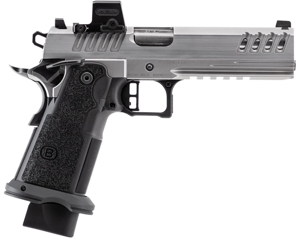 The M2XI excels in rapid target acquisition, the pistol ensures unmatched accuracy and reliability. Built with a durable 416 stainless steel slide and frame; 5″ ultra-match bull barrel; ergonomically designed with an injected polymer grip; extended beavertail; flared magwell; co-witnessing raised rear iron sights, front night sight; Holosun K-Series optics cut slide; ambidextrous controls; Picatinny rail, and dual magazine capacity. Includes 17rd and 22rd magazines.