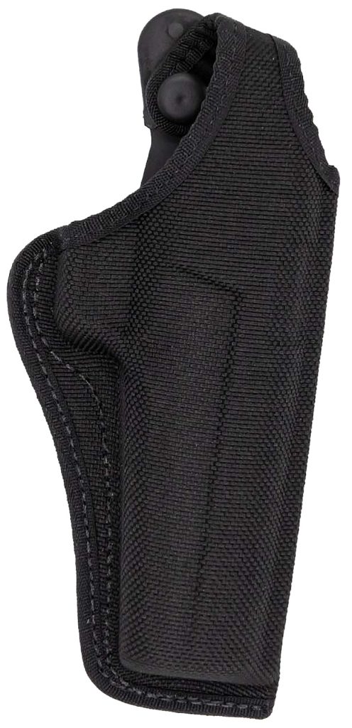 Bianchi’s holster with thumb snap closure is suitable for outdoor and concealment applications. Its trilaminate construction of a closed-cell foam center, poly-knit inner lining and the ballistic weave outer finish offers sturdy protection for the handgun. The holster rides at a 10-13 degree forward angle for an instinctive draw. The Roll-Top thumb break strap wraps cleanly over hammer. The belt slides through the Quick-Slide 1.75″ (45 mm) belt loop. Fits Colt King Cobra, Python 6″; Llama Comanche, Martial 6″; Ruger GP100 6″; S&W 19 and similar K/L Frame 6″; Taurus 66, 80, 669 6″.