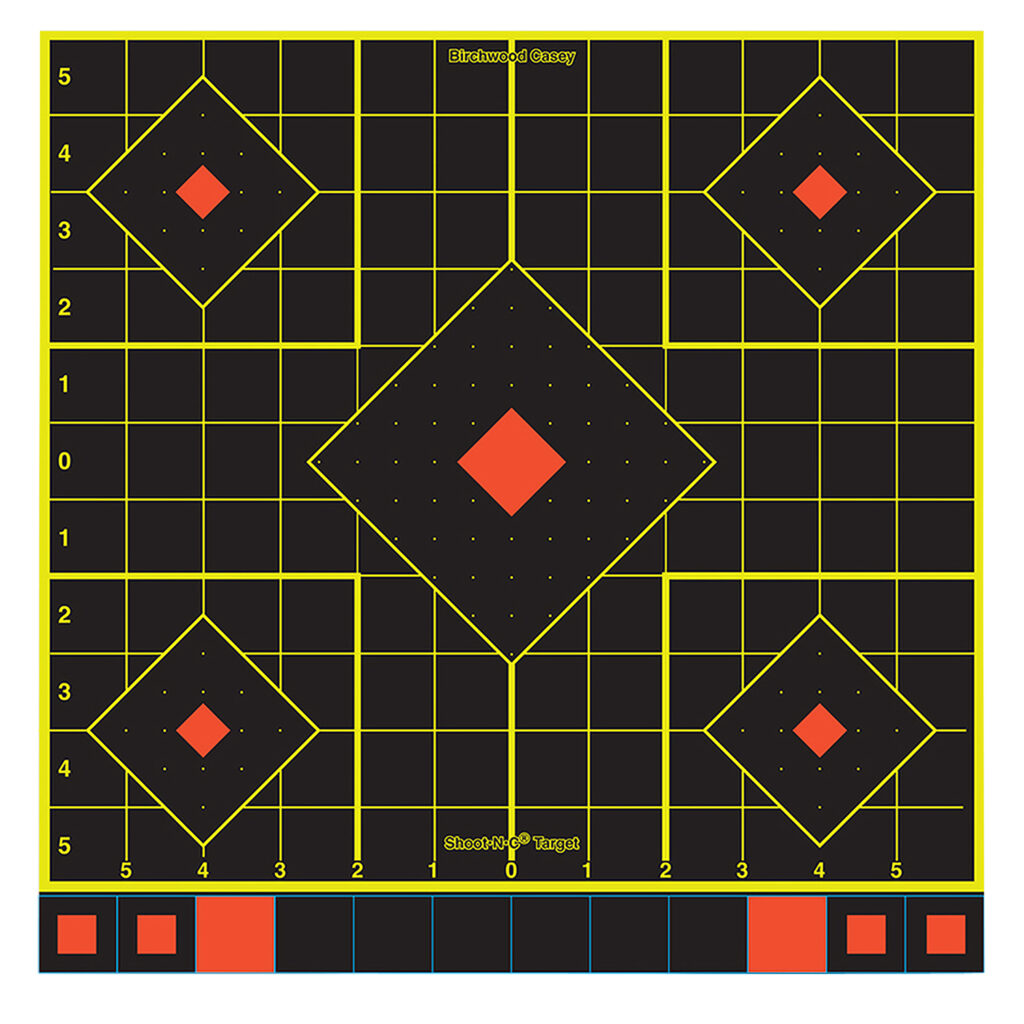 Five targets on each sheet use center target for sighting-in and four smaller targets for testing results of various ballistic loads or for confirmation of sight-in groups. Convenient 1 inch numbered grid lines simplify scope adjustments.