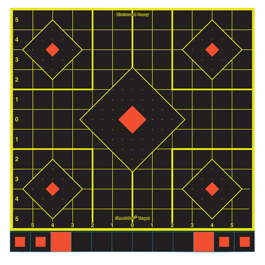 With Birchwood Shoot-N-C Sight-In target bullet holes are revealed with bright chartreuse rings. Five targets on each sheet, use center target for sighting-in and four smaller targets for testing results of various ballistic loads or for confirmation of sight-in groups. The convenient 1″ numbered grid lines simplify scope adjustments. Self adhesive backing makes targets easy to place. Great for indoor or outdoor use and low light conditions. Includes 144 repair pasters to lengthen target life.