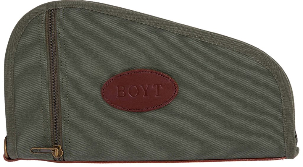 Boyt’s Heart-Shaped Pistol Case features a waxed canvas shell with non-compressible cotton batten padding and flannel lining with pockets.