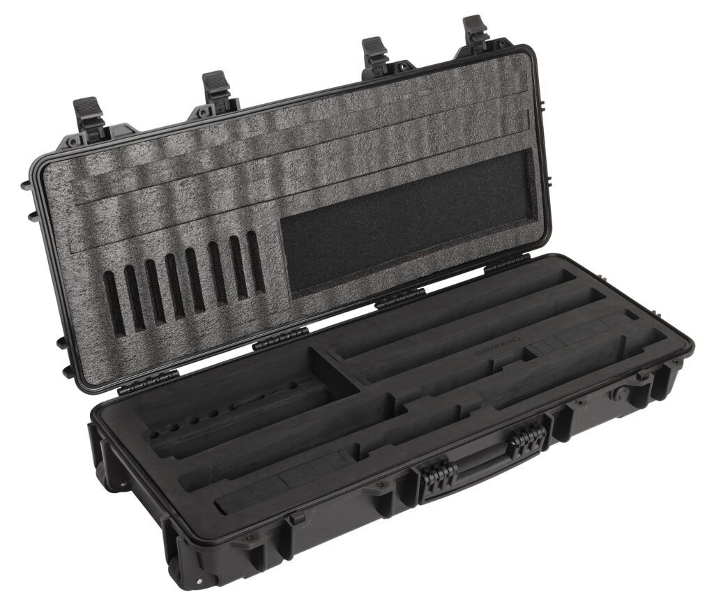 Heavy-duty travel case offers maximum protection for over and under shotguns. Heavy-duty injection molded fiberglass shell construction. Folding handles and wheels for easy transport. Fitted EVA interior. – Features – Waterproof and airtight with o-ring lid seal – Heavy-duty injection-molded reinforced fiberglass shell – Fitted EVA interior – Dedicated storage for choke tubes and wrenches; additional storage for accessories – Pressure control air valve – O-ring lid seal – Two locking points for user-supplied padlocks – Two roller wheels – Folding handles on end and side – Airline approved – Fits two over and under shotguns – 39 (W) x 16 (D) x 7 (H)