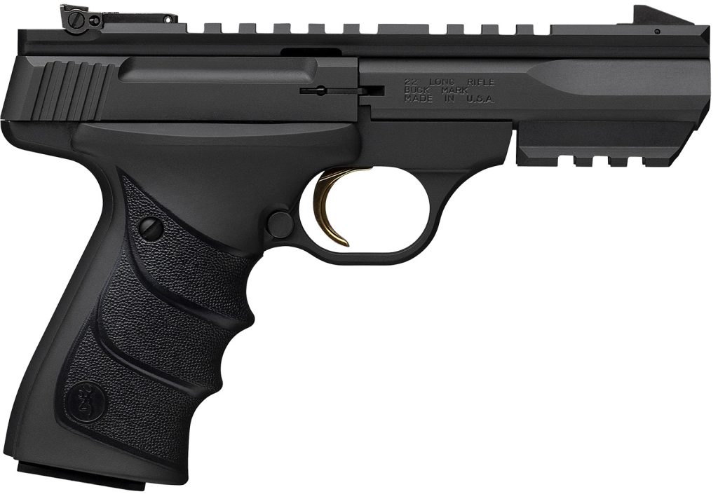 Browning 051602490 Buck Mark Black Label URX 22 LR 10+1 5.50″ Matte Blued Contoured Barrel, Matte Black Serrated Slide, Matte Black Aluminum Frame w/Picatinny Rail, Black UFX Overmolded Grip