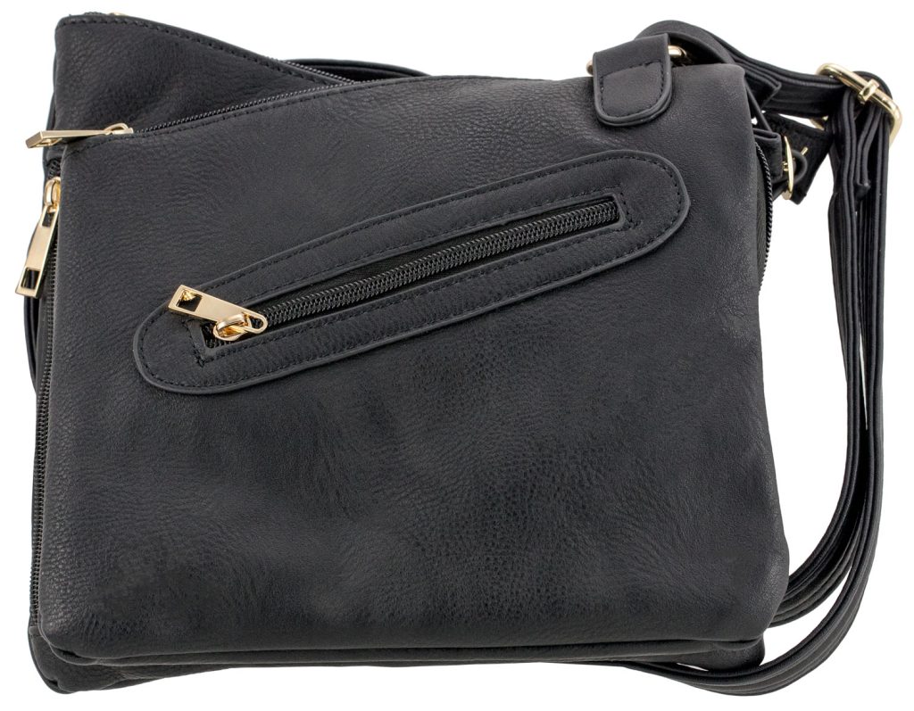 Bulldog’s Cross body style purse is designed to fit most small autos and revolvers. It features an universal fit, color matched holster and is made from durable leather. The two separate zippered main compartments features multiple inner compartments which are fully lined, while the one external compartment is for small accessories. This small cross body purse dimensions are 9.5″ x 9.5 “x 1.5” and has a black finish.
