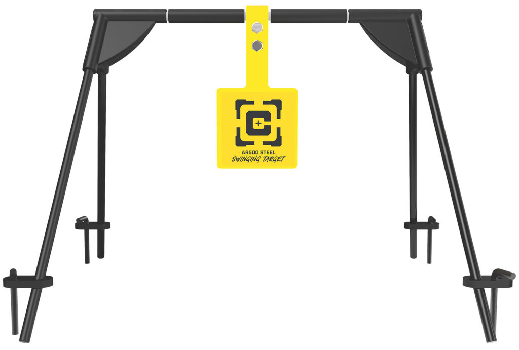 Caldwell AR500 Swinging Target is constructed using 3/8″ rifle rated AR500 steel. The extremely durable cast urethane frame connectors provide a rigid frame yet allows bullets to pass through without damage. The solid steel legs and crossbar provide a rigid frame that can be replaced by 1/2″” rebar if damaged. The target frame is 18″” off the ground and 10″” to the center of the target. The AR500 Swinging Target is highly portable for ease of use. 4 ground stakes are included to secure the target for large rifle impacts. Perfect for centerfire rifles and handguns, these targets are rated up to 3,000 fps impact velocity and 3,500 ft-lb impact energy.
