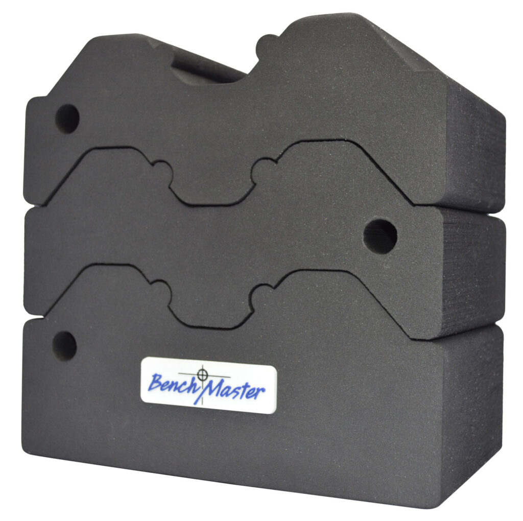 The BenchMaster Adjustable 3-piece Bench Block comes with three interlocking bench blocks that can be used separately or in any combination of the three blocks. The bench blocks have a rubber cradle to prevent nicks and scratches on the barrel and a rubber bottom to prevent slippage. It is ideal for a barrel or buttstock rest or can be used for both. Helps improve accuracy, reduce recoil and has two carry loops for easy transport. The high-density foam construction will stand up in bad weather and has low water absorption, excellent chemical resistance (gun oil), and is impervious to rot, mold, and mildew. Made in the USA.