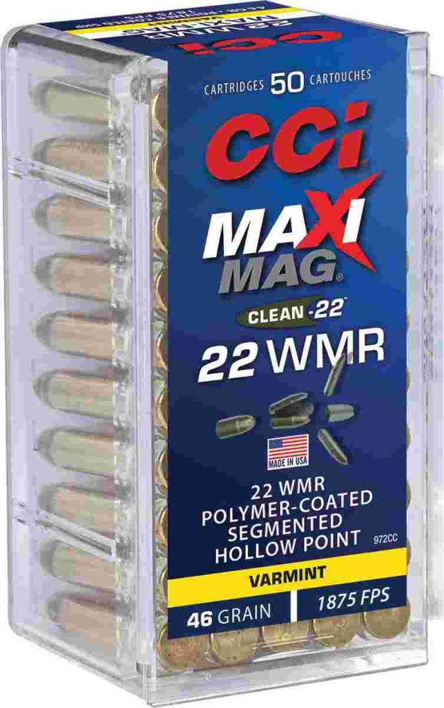 The coating technology that made rimfire clean is now being used to extend the range and power of 22 WMR. New Maxi-Mag Segmented HP uses an exclusive polymer bullet coating to greatly reduce copper and lead fouling in the barrel—without leaving a residue. It also cuts lead buildup in suppressors 60 to 80 percent. The load's 46-grain Segmented Hollow Point splits into three equal-size pieces on impact tripling the number of wound channels. The polymer bullet coating allows this separation at much lower velocities and longer distances than a conventional copper jacket. The bullet's overall geometry is optimized for accuracy and dependable CCI priming and propellant provide flawless cycling through semi-automatics and all 22 WMR firearms.