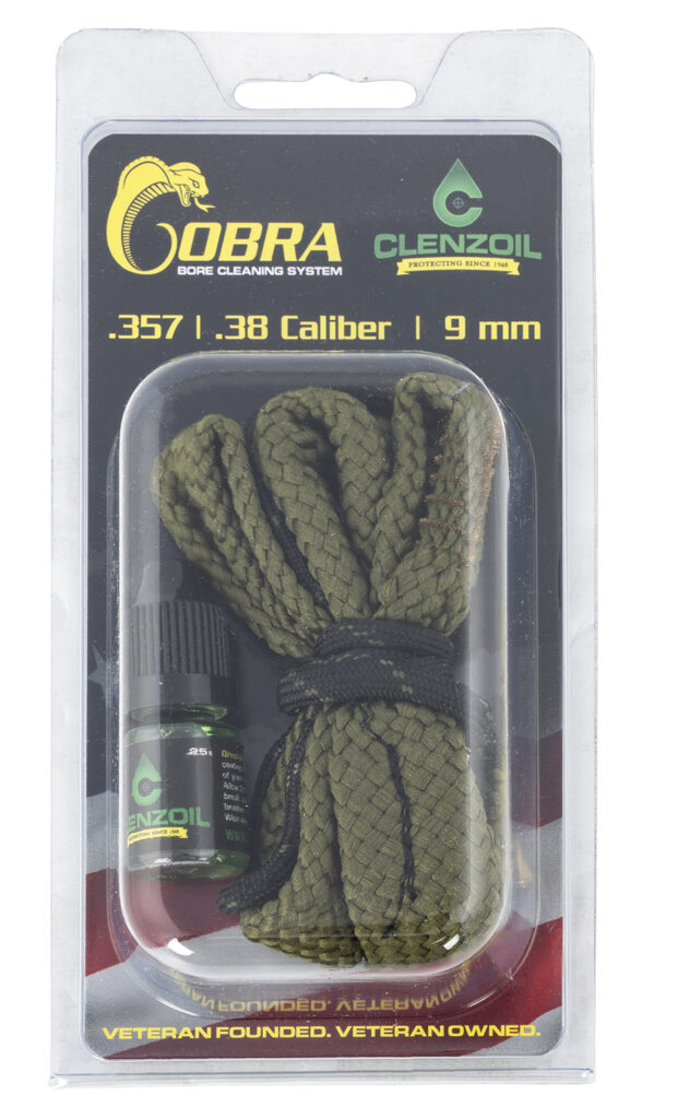 The Clenzoil Cobra is a high quality bore cleaning system that incorporates all of the essential components of effective bore cleaning into one unique design. When used in conjunction with Clenzoil Field & Range solution, the Clenzoil Cobra provides a quick and easy solution to regular firearm maintenance. Its integrated bronze brush effectively loosens fouling and lead and the woven cotton braid that follows collects the debris. Completely washable, the Clenzoil Cobra can be reused over and over again.