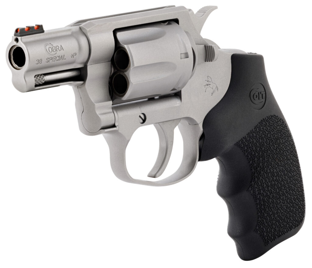 Shooter’s Model are 100% New in the Box products that may have a slight finish imperfection that is not covered by Colt’s one year warranty. The slight imperfection would occur during the manufacturing process and are typically very hard to see except to the well-trained eye or with a magnifier. – Built for Precision: Constructed with a one-piece stainless steel barrel the Colt Cobra® includes a recessed crown and fiber optic front sight delivering precise accuracy. – Durable Linear Leaf Mainspring: Engineered for long-lasting performance and dependable operation it delivers a smooth trigger pull for improved precision. Ideal for both new shooters and seasoned professionals. – Upgraded Hogue® OverMolded Rubber Grips: Ergonomic finger grooves and a durable high-traction rubber surface offer a secure comfortable grip for improved control and reduced recoil. – Compact Lightweight Design: Small-frame double-action 38 Special revolver built for everyday carry. – Unloaded Weight 24.6 oz – Capacity 6 Rounds – Frame Material Stainless Steel – Finish Brushed Stainless – Barrel Technical 1:14 LH 6 Groove – Barrel Length 2 – Overall Length 7 – Overall Height 5 – Overall Width 1.4 – Front Sight Red Fiber Optic – Rear Sight Integral Notch – Trigger Action Double and Single-Action – Trigger Weight 7-10 lbs DA 3-4 lbs SA – Grip Hogue® OverMolded Rubber Grips
