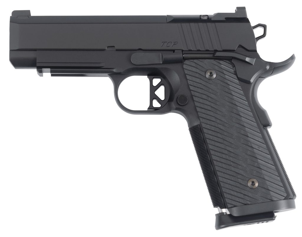 The Tactical Compact Pistol (or TCP for short) combines a match grade bull barrel and a lighter railed alloy frame to make a highly accurate concealable 1911. – The TCP has a compact stainless slide tri-topped and aggressive slide serrations. A top rib helps reduce glare and it features our new U-notch rear sight with a whopping .156 wide notch paired with our brass-beaded front sight. – Its ramped bull barrel has a 30 degree crown and is flush cut for easier disassembly. Its recoil system uses a flat wire recoil spring rated for 15000 rounds in 45 ACP thats three times the round count of a typical 1911 dual recoil spring setup. – The TCP’s grips are also new with a tapered profile that is slim at the top and full-width at the bottom giving shooters with smaller hands an easier reach to the trigger. With three facets that mimic the distinctive slide their serrated features encourage a high deep grip. Our one-piece magwell flat K-style trigger and square hammer round out the features. – All-in the TCP tips the scales at just 32 ounces making it an accurate pistol thats easy to carry daily. – Features – U-notch Rear Sight This U-shaped sight notch allows for a better float of the front dot making it easier for the eye to align. – Brass Bead Front Sight An old world method using Naval Brass this makes for a higher visibility front sight. – Serrated Rib Our flat top rib reduces any glare between the front and rear sight. – Rail Equipped with a 1913 Picatinny rail adding a light or laser is a simple operation. – Square Hammer This is our spin on an edgier tactical Commander hammer. – Long K-Style Trigger The long K-style trigger is a twist on the standard three hole trigger that looks like a ‘K’. – Mainspring Housing Checkering Our 25 LPI checkering on the flat mainspring housing provides the means for a superb grip. – Magwell Reloads are made easy our magwell helps to funnel the fresh mag into the gun. – Bull barrel Utilizing a 30 degree crown the flush cut bull barrel provides an easier disassembly. – Flat K style trigger The flat K-style trigger is a twist on the standard three hole trigger that looks like a K.