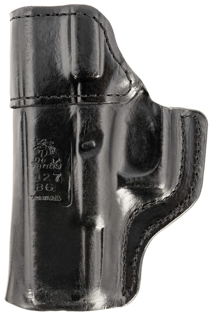 The Inside Heat is a bare bones minimum IWB holster built from black saddle leather. The precise molded contours provide the weapon retention. The top is reinforced to ease re-holstering and the powder coated spring clip holds it securely to your belt.