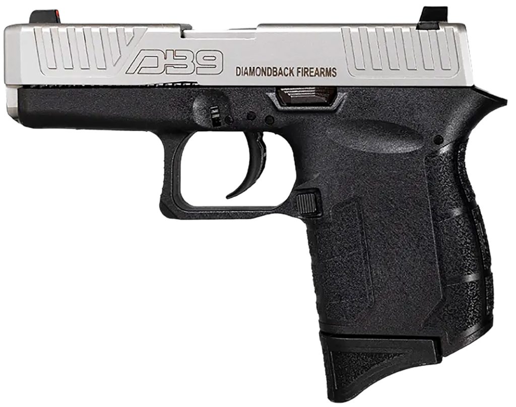 The Diamondback DB9 G4 is a micro-compact 9mm pistol made entirely in the USA. Designed with safety in mind, the DB9 features a “ZERO-Energy” striker firing system with a mechanical firing pin block; a steel magazine catch to secure a sheet metal magazine; real windage-adjustable sights; steel trigger with dual connecting bars allows for a crisp, smooth, trigger pull; FEA (Finite Element Analysis) designed slide and barrel that is stronger than any comparable firearm, resulting in durability with less felt recoil, and the absence of removable pins or tools makes field stripping easier than ever. The slide, barrel, and internal parts are coated to resist corrosion, making this pistol a lifetime investment.