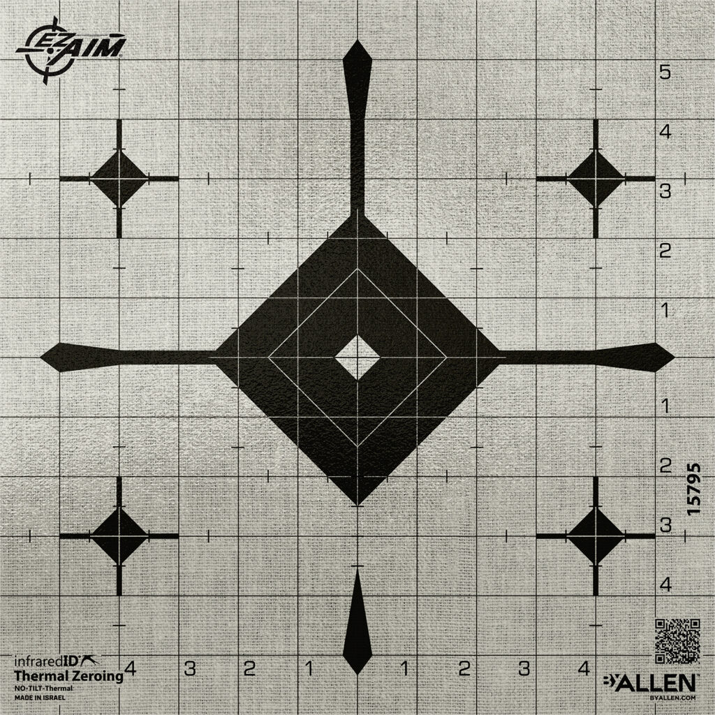 The target face is a 5-spot sight-in grid with 1-inch gridlines, sized at 12″x12″. THERMAL ID TECHNOLOGY- Patented treatment provides distinct heat signatures for thermal imaging scopes. Daylight compatible.