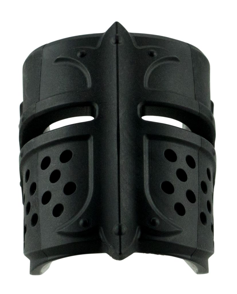 The Mojo is the first product developed with the recreational shooter in mind. It transforms the standard AR Magwell into a comfortable and ergonomic foregrip with a flared and extended magazine well that enhances reload speed, while adding an ornamental aspect to the civilian firearm. The Mojo has a system of easily replaceable grips; the Tactical grip can be used while performing drills on the range, and then quickly replaced with a Mask grip, according to personal preferences. It is constructed of a durable and lightweight fiberglass reinforced polymer and is compatible with M16 5.56×45 lower receiver variants, without a flared magazine well. (May not work well with the PMAG GEN3) This model has a black finish and Crusader mask.