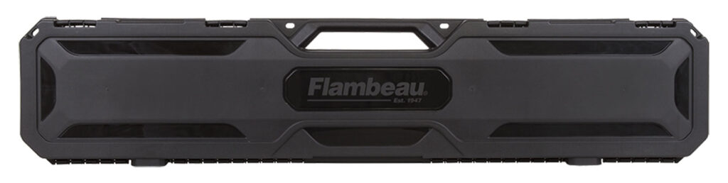 Flambeau’s Express Gun Case is constructed of a rugged polymer with convoluted foam set with deep cushioning and piano-style hinges for storage safety when locked. It utilizes four (4) lock hasps and latches. This model has a black finish and is compatible with one (1) scoped rifle or shotgun. It has interior dimensions of 46.125″ L x 9.25″ W x 3.5″ D.