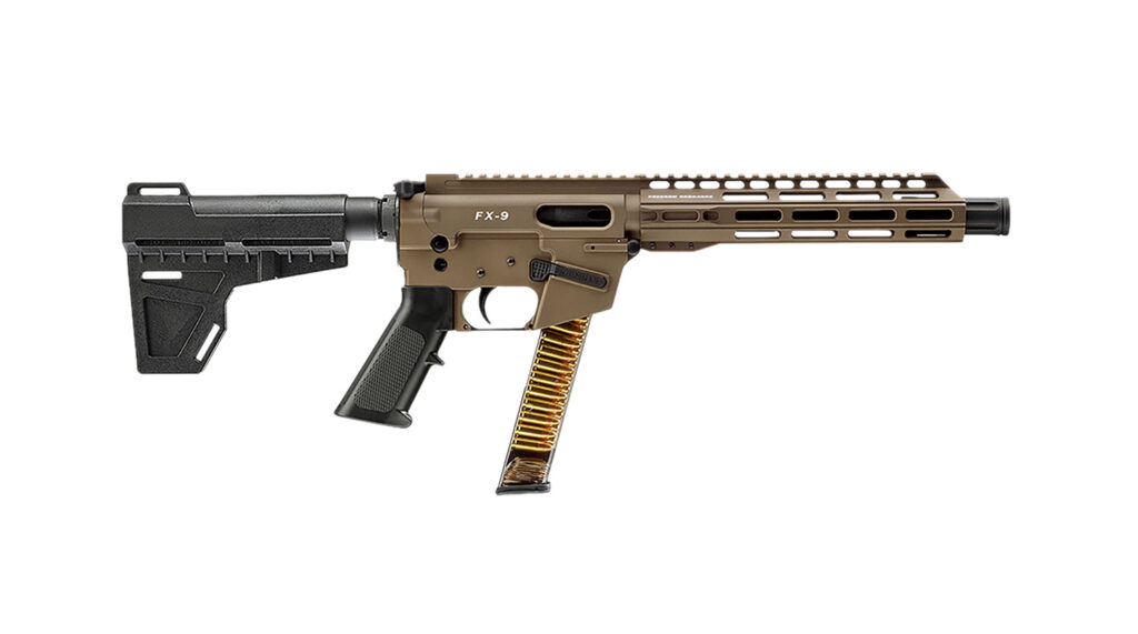 The FX-9 pistol with the KAK Shockwave Blade pistol brace installed from the factory. All models are equipped with a faux suppressor.