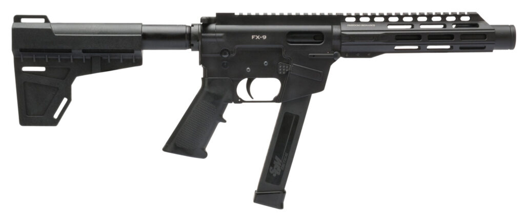 The FX-9 pistol (Freedom Xtreme) has a familiar set of operating controls for the avid AR-15 user, it accepts AR-15 stocks and buffer tube assemblies, as well as most free-float AR-15 rail assemblies. The FX-9 is machined from billet material, anodized type III aluminum components, and full hard nitride steel components including the barrel, bolt, ejector, last round hold open, feed ramp, and extractor for extended wear properties and corrosion resistance. The upper and lower receiver are more than 1″ shorter than a standard AR-15, making it more compact and lighter. The FX-9 uses standard, double-stack Glock-style 9mm magazines. This model features a 7.375″ free-floating M-Lok rail, 8.25″ barrel, KAK stabilizing arm brace, and comes with a 33-round magazine.