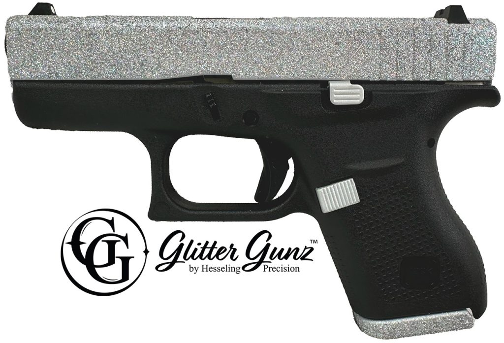 GlitterGunz is a durable sparkling coating applied utilizing specialized equipment and a patent-pending process. The slight tactile texture of the coating provides the user with a non-slip grip making it easier to operate a semiauto handgun’s slide.