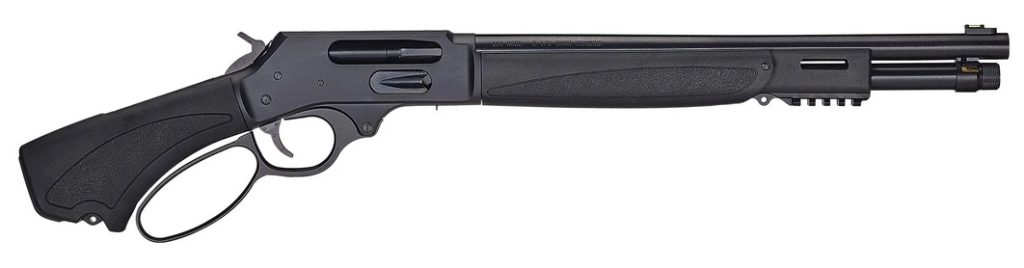 Model Number H018XAH-410 – Action Type Lever Action – Caliber .410 Bore – Chamber Size 2 1/2 Shells – Capacity 5 Rounds – Barrel Length 15.14 – Barrel Type Round Blued Steel – Overall Length 26.4 – Weight 5.75 lbs. – Receiver Finish Blued Steel – Rear Sight None – Front Sight Fiber Optic – Scopeability Drilled and Tapped – Scope Mount Type Weaver 63B – Stock Material Black Synthetic – Safety Transfer Bar – Best Uses Target/Plinking/Utility – Embellishments/Extras Internally Threaded for Invector Style Chokes (Full included). Swivel Studs Large Loop Lever M-Lok Mounts Picatinny Rail Mount