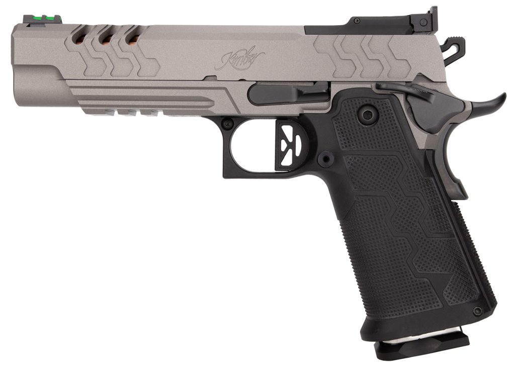 Kimber has reached the summit of high capacity 1911 design. The 2K11 is the most capable out-of-the-box high-capacity 1911 variant available. From hammer to muzzle the 2K11 has been built around all the features Kimber enthusiasts requested. The anchor to this performance starts with an enhanced sub-frame shaped for superior magazine fit and control. It comes standard with an accessory rail for optional lights and lasers. The slide is made of stainless steel and features an external extractor for incredible reliability a ramped barrel aids in consistent feeding. The new MJD Designs Kevlar® and carbon fiber grip deliver superior strength and echo the slide serrations found on this model. This combines to make the 2K11 a masterpiece of modern firearms design from Kimber. – Specifications – Height (inches) 90° to barrel: 5.74 – Weight (ounces) with empty magazine: 35 – Length (inches): 8.56 – Magazine capacity: 17/20 Rounds – Recoil spring (pounds): 10 (3 magazines included) – Toolless Guide Rod (Patent-pending) – Kevlar® Carbon Fiber Grip Module – Frame – Material: Stainless Steel – Matte KimPro Granite finish – Width (inches): 1.53 – Bumped grip safety – Front strap checkering (LPI) – Ambidextrous thumb safety – Slide – Material: Stainless Steel – External extractor – Matte KimPro Granite finish – Custom 2K11 front and rear serrations – Barrel – Length (inches): 5 – Material: Stainless Steel – Twist rate (left hand): 5R rifling 9MM:1:10 – Fluted – Ramped – Highly Polished with Coyote PVD – Sights – TAG Fiberlok 2 – Additional red abd black fiber-optic inserts included – 6.8 Radius – Grips Material: Kevlar® Carbon Fiber – Trigger – GT Match Grade Trigger – 3-4lb pull – Material: Aluminum