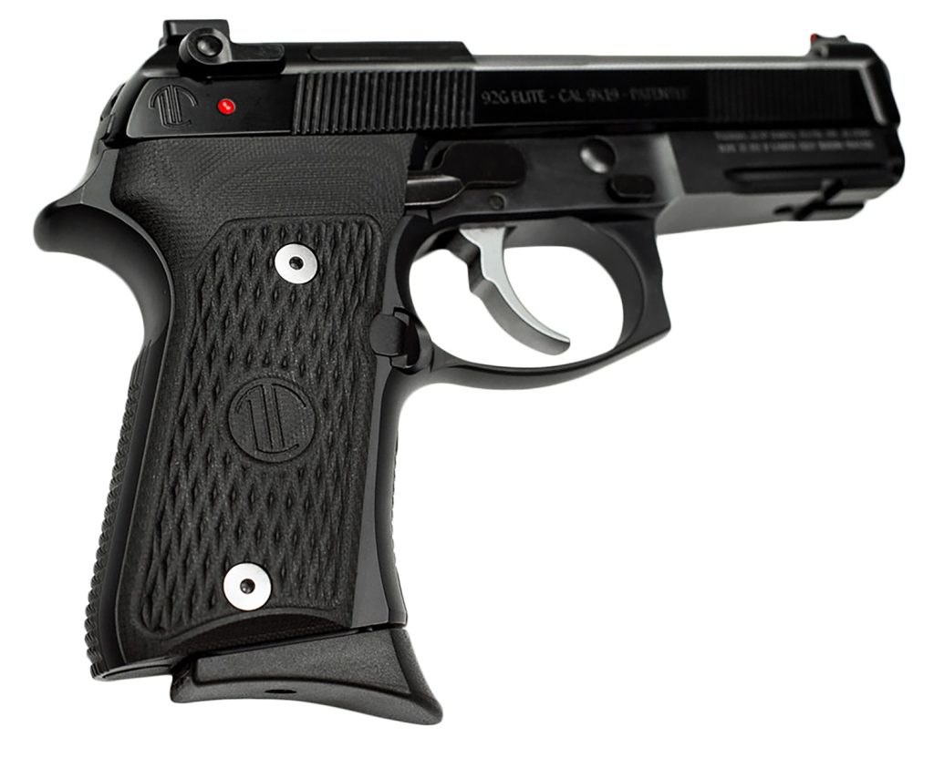 The Elite LTT comes with (3) 15-round magazines. Elite LTT with an LTT Trigger Job will come with a 13# Chrome Silicon Hammer Spring. SLIDE: Shortened 92G Vertec Slide, Front Cocking Serration, G-Model Decock only, Dovetailed Fiber Optic Front Sight (.110 inch wide serrated), Square Notch Serrated Rear Sight, Stainless 4.25 inch Barrel with Target Crown, Solid Steel Guide Rod, Beveled Rear Slide. FRAME: M9A1 Frame, Exclusive Radiused Trigger Guard, Stainless Steel Trigger, Checkering on the front and back strap, Spurless Hammer, Ultra Thin VZ/LTT G10 Grips, Stainless Steel Hex Head Grip Screws, Beveled Magazine Well, D Model Hammer Spring, Flush Main Spring Cap (No Lanyard Loop), Oversized Magazine Release Button.