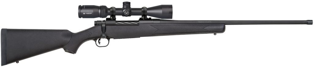 Mossberg’s Patriot Vortex Scoped Combos feature drop box magazines, recessed crowns, fluted barrels, spiral fluted bolt, streamlined bolt handle, Weaver scope bases, patented LBA user-adjustable trigger system. Crossfire II3-940 Riflescope with Dead-Hold BDC Reticle features long eye relief, a fast-focus eyepiece, fully multi-coated lenses and resettable MOA turrets. Clear, tough and bright, the hard anodized single-piece aircraft-grade aluminum tube is nitrogen purged and o-ring sealed for waterproof/fogproof performance. The Dead-Hold BDC Reticles customized hashmark design helps eliminate guesswork on holdover and windage corrections. Good at varying ranges where estimating holdover is a concern.