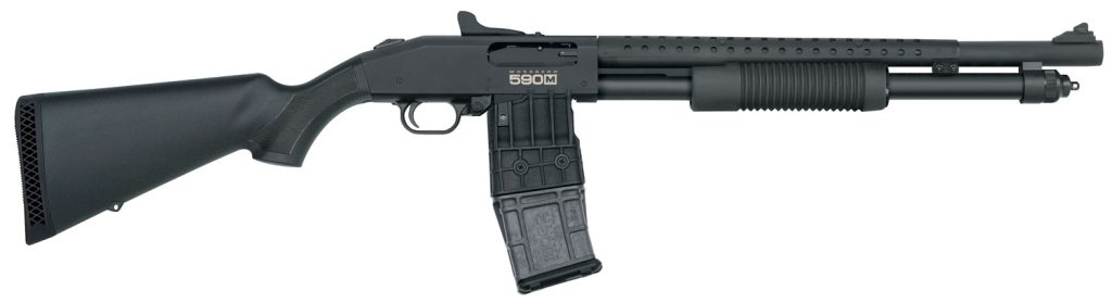 The 590M offers magazine-fed convenience in the legendary Mossberg pump-action tactical platform. The shotgun and magazine are uniquely designed incorporating stabilizing ribs that engage the magazine directly to the receiver for a sure lockup. The features Mossberg tactical pump users expect are all there: dual extractors, twin action bars, positive steel-to-steel lockup, drilled and tapped receiver, ambidextrous safety, and a heavy-walled barrel.