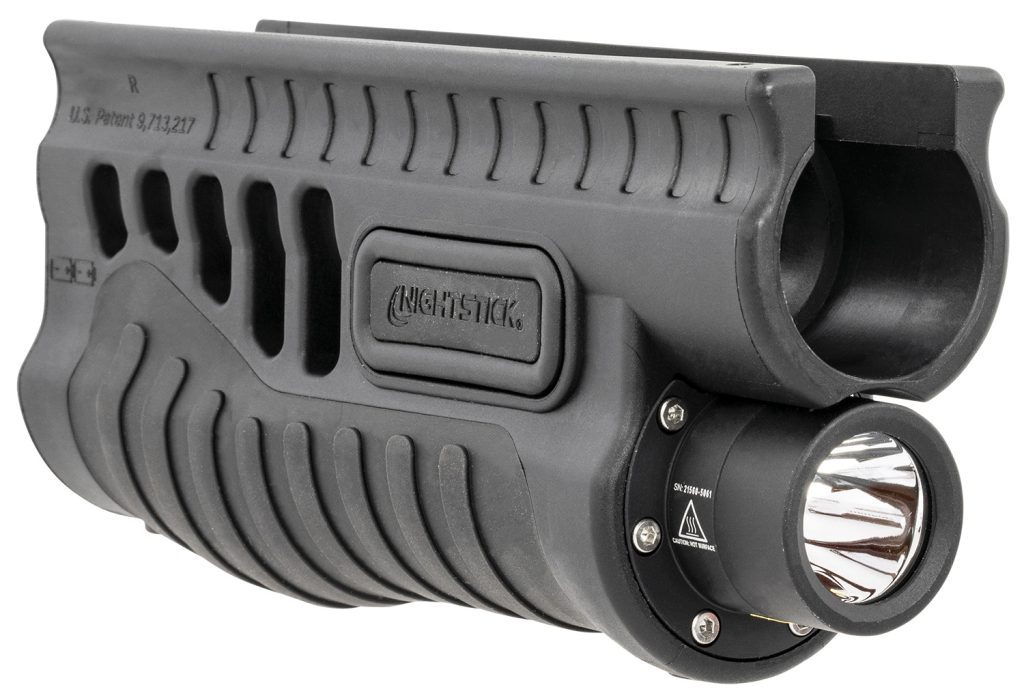 The SFL-13GL shotgun forend weapon light with green laser is a complete forend replacement for your 12 gauge Remington 870 and TAC-14 pump-action shotgun. Built from a one-piece body of heavy-duty glass-filled nylon with an over-molded rubber grip area, it features a super-bright LED rated at 1200 lumens with an hour and a half runtime. Designed around a high-efficiency deep parabolic reflector, the tightly focused beam has a 203-meter beam distance.The SFL forend features ambidextrous switches positioned intuitively towards the front for easy activation. Both buttons are surrounded by a small raised bump guard that helps prevent accidental activation while racking the action or laying it on its side. The light also features an ergonomic palm swell design to improve grip during light activation and weapon manipulation under stress. Each SFL comes with an optional hand stop/safety strap and Nightstick’s SFL action tube nut wrench for removal of factory-installed castle nut and pump handle fore-end. Comes with two CR123 batteries, but can be upgraded to li-ion rechargeable with optional 18650-KIT.