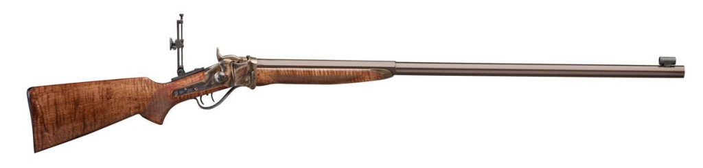 Accurate reproduction of the rifle Sharps Long Range model made in December of 1876 converting rifles with 32 (813 mm) barrels length to 34 (864 mm). At the beginning it was produced with single trigger only in February of 1879 some hundred pieces have been made with double set trigger. – Stock and forend are made of selected Tiger Maple checkered. – The stock of civil type with pistol grip and cheek piece enables the shooting stability. The forend is completed with a German silver cap. – Grooves 6 – Twist 1:18 – Barrel Length 34 – Overall length 50 13/16 – Weight 12.11 lbs – Set trigger yes – Tunnel sight USA 455 – Caliber .45-70