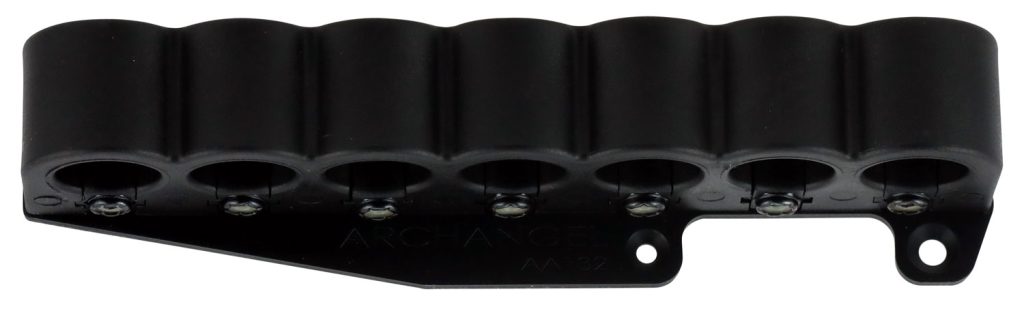 The Archangel 7rd, 20 gauge shell carrier mounts to the side of the receiver on Remington 870 shotguns. A retention adjustment system allows for the individual tension adjustment for each shell allowing the user to fine tune the shell carrier for specific ammunition and the level of retention required. A rubber molded gasket fits between the mount and the receiver to protect the firearms finish. Shell carrier will not contact or interfere with the pump action forend when used with military length forends. Made in the USA.