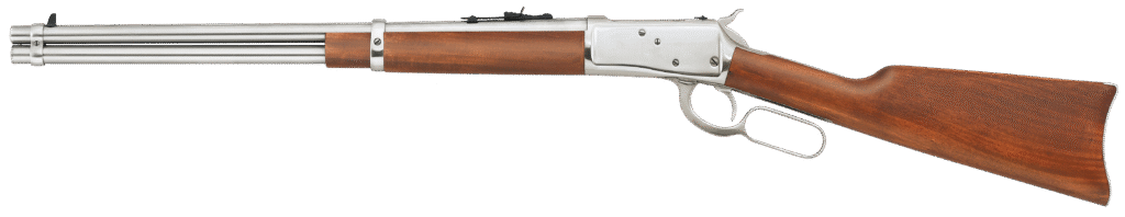 The R92 lever action carbine features a stainless steel barrel, a polished stainless finish, a Brazilian hardwood stock, and a fixed/adjustable Buckhorn sight.
