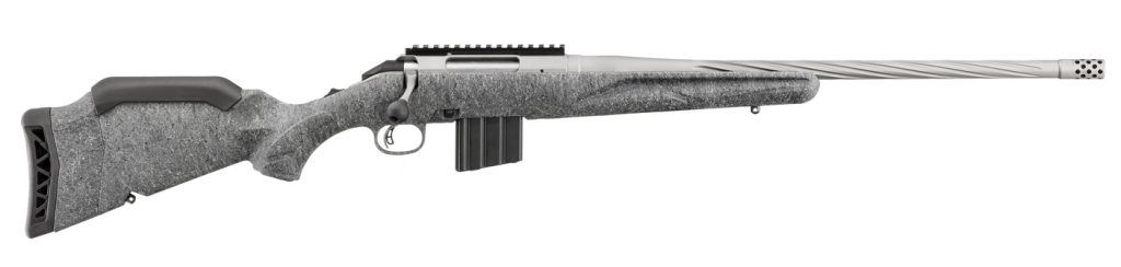 Caliber: 6.5 Grendel – StockGray Splatter Gen II American – Barrel Fluting Spiral – Barrel Length 20 – Barrel Finish Gun Metal Gray Cerakote – Thread Pattern 5/8-24 – Capacity 10 – Magazine Type AR-Style – Sights None-Picatinny Scope Base – Material Alloy Steel – Weight 6.5 lb. – Twist 1:8 RH – Overall Length 41.25 – Length of Pull 12-13.75 – Grooves 5 – Splatter finished stock provides excellent grip without being too sharp or abrasive. – Soft rubber recoil pad features a large radius on the heel for easy shouldering and improved geometry that progressively collapses to reduce felt recoil. – Removing the installed spacer allows for length of pull to be adjusted from 13.75 to 12. – Installed low comb improves sight alignment when using magnified optics but can be removed when utilizing low-mounted sights. More comb options are available at ShopRuger.com to further refine the fit. – Professionally applied Cerakote coating on barrel muzzle brake receiver and bolt handle results in a durable easy-to-maintain finish. – Medium contour barrel features deep spiral flutes that reduce weight at the muzzle end of the barrel to improve balance without sacrificing stiffness or accuracy. – Threaded barrel with factory-installed radial port muzzle brake is cold hammer-forged resulting in ultra-precise rifling that provides exceptional accuracy and longevity. – Intuitive three-position tang safety locks the bolt preventing inadvertent bolt opening while allowing the rifle to be loaded with the safety engaged. – Ruger Marksman Adjustable trigger offers a crisp release with a pull weight that is user-adjustable between 3 and 5 pounds. – Patented Power Bedding integral bedding block system positively locates the receiver and free-floats the barrel for outstanding accuracy. – The one-piece bolt is CNC machined from stainless steel for smooth operation and the familiar three-lug design with 70° throw provides ample scope clearance. – Oversized bolt handle for positive bolt manipulation with a 5/16-24 thread pattern for easy replacement. – Factory-installed one-piece Picatinny scope base. – Available accessory stock weight kit adds up to 1.6 pounds to the butt of the rifle to absorb recoil and improve the rifle’s balance when utilizing heavier muzzle devices. – Also includes: one magazine; steel sling swivel studs.