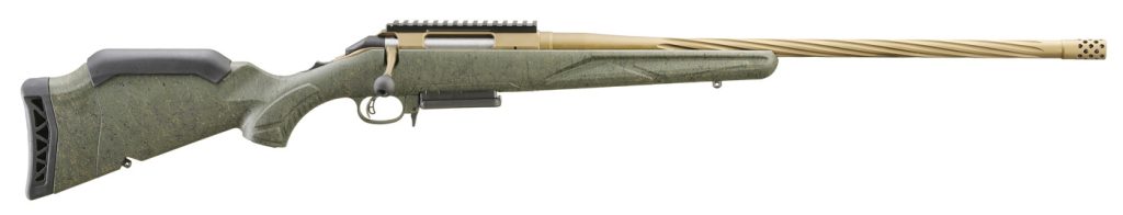 Caliber: 7mm-08 Rem – Stock Green Splatter Gen II American – Barrel Fluting Spiral – Barrel Length 22 – Barrel Finish Burnt Bronze Cerakote – Thread Pattern 5/8-24 – Capacity 3 – Magazine Type AI-Style – Sights None-Picatinny Scope Base – Material Alloy Steel – Weight 6.6 lb. – Twist 1:8.5 RH – Overall Length 43.25 – Length of Pull 12-13.75 – Grooves 5 – Splatter finished stock provides excellent grip without being too sharp or abrasive. – Soft rubber recoil pad features a large radius on the heel for easy shouldering and improved geometry that progressively collapses to reduce felt recoil. – Removing the installed spacer allows for length of pull to be adjusted from 13.75 to 12. – Installed low comb improves sight alignment when using magnified optics but can be removed when utilizing low-mounted sights. – Professionally applied Cerakote coating on barrel muzzle brake receiver and bolt handle results in a durable easy-to-maintain finish. – Medium contour barrel features deep spiral flutes that reduce weight at the muzzle end of the barrel to improve balance without sacrificing stiffness or accuracy. – Threaded barrel with factory-installed radial port muzzle brake is cold hammer-forged resulting in ultra-precise rifling that provides exceptional accuracy and longevity. – Intuitive three-position tang safety locks the bolt preventing inadvertent bolt opening while allowing the rifle to be loaded with the safety engaged. – Ruger Marksman Adjustable trigger offers a crisp release with a pull weight that is user-adjustable between 3 and 5 pounds. – Patented Power Bedding integral bedding block system positively locates the receiver and free-floats the barrel for outstanding accuracy. – The one-piece bolt is CNC machined from stainless steel for smooth operation and the familiar three-lug design with 70° throw provides ample scope clearance. – Oversized bolt handle for positive bolt manipulation with a 5/16-24 thread pattern for easy replacement. – Factory-installed one-piece Picatinny scope base. – Available accessory stock weight kit adds up to 1.6 pounds to the butt of the rifle to absorb recoil and improve the rifle’s balance when utilizing heavier muzzle devices. – Also includes: one magazine; steel sling swivel studs.