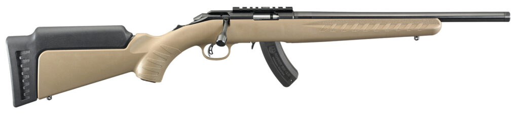 Caliber: 22 WMR – Stock Flat Dark Earth Synthetic – Capacity 15 – Overall Length 35 – Barrel Length 16 – Front Sight None – Rear Sight None – Thread Pattern 1/2-28 – Length of Pull 13.75 – Weight 5.3 lb. – Material Alloy Steel – Finish Satin Blued – Twist 1:14 RH – Grooves 6 – Includes interchangeable standard length of pull high comb stock module ideal for use with optics. By simply removing the rear sling swivel stud stock module can be changed in seconds. – Includes the detachable BX-15® Magnum magazine. – Ergonomic lightweight synthetic stock (designed for quick easy handling) blends a classic look with modern forend contouring and grip serrations. – Easy-to-use extended magazine release provides smooth no-fuss removal of the flush-mounted magazine. – Patented Power Bedding integral bedding block system positively locates the receiver and free-floats the barrel for outstanding accuracy. – Ruger Marksman Adjustable trigger offers a crisp release with a pull weight that is user adjustable between three and five pounds allowing shooters to make that perfect shot. – Features a visible accessible and easy-to-actuate tang safety that provides instant security. – Threaded barrel with factory-installed thread protector is cold hammer-forged resulting in ultra-precise rifling that provides exceptional accuracy and longevity. – Factory-installed one-piece aluminum scope rail. – A 60° bolt throw provides ample scope clearance and the easy-to-use receiver-mounted bolt release allows the bolt to be readily removed without requiring a pull of the trigger a unique safety feature among rimfire bolt-action rifles. – Also includes: sling swivel studs.