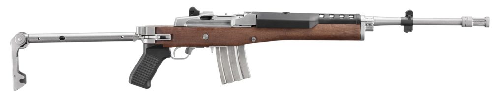Caliber: 5.56 NATO – Stock Walnut with Stainless Side-Folder – Front Sight Protected Blade with Bayonet Lug – Rear Sight Adjustable – Material Stainless Steel – Thread Pattern 1/2-28 – Twist 1:9 RH – Capacity 20 – Finish Matte Stainless – Weight 7.5 lb. – Overall Length 39.25 – Barrel Length 18.50 – Length of Pull 13.50 – Grooves 6 – Walnut stock features a stainless side-folder made from original Ruger casting tooling and an injection molded polymer pistol grip. – Simple rugged Garand-style action with breech bolt locking system a fixed-piston gas system and self-cleaning moving gas cylinder gives unparalleled reliability under harsh operating conditions. – Threaded barrel with factory-installed flash suppressor is cold hammer-forged resulting in ultra-precise rifling that provides exceptional accuracy and longevity. – Integral scope mounts machined directly on the solid steel receiver provide a stable mounting surface for included scope rings eliminating a potential source of looseness and inaccuracy in the field. – Accurate sighting system with ghost ring rear aperture sight and a non-glare protected blade front sight with bayonet lug. – Receiver is drilled and tapped for mounting the included Picatinny rail. – Also includes: Two nickel-Teflon® plated steel magazines.