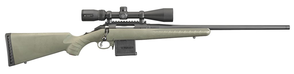 Ruger’s American Rifle offers minute-of-angle accuracy that can make every hunt a success. The one-piece, three-lug bolt with 70 degree throw provides ample scope clearance and utilizes a full diameter bolt body and dual cocking cams for smooth, easy cycling. Its patent-pending Power Bedding, integral bedding block system positively locates the receiver and free-floats the barrel for outstanding accuracy. The ergonomic, lightweight synthetic stock with soft rubber buttpad is designed for quick, easy handling and blends a classic look with modern forend contouring and grip serrations. The American Rifle also has a Ruger Marksman adjustable trigger, cold hammer-forged barrel and a tang safety. Includes magazine and sling swivel studs.