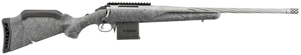 The Ruger American’s professionally applied Cerakote coating on the barrel, muzzle brake, receiver and bolt handle results in a durable, easy-to-maintain finish. The stock provides excellent grip without being too sharp or abrasive. A soft rubber recoil pad features a large radius on the heel for easy shouldering and improved geometry that progressively collapses to reduce felt recoil. Removing the installed spacer allows for length of pull to be adjusted from 13.75″ to 12″. Installed low comb improves sight alignment when using magnified optics but can be removed when utilizing low-mounted sights. The medium contour barrel features deep spiral flutes that reduce weight at the muzzle end of the barrel to improve balance without sacrificing stiffness or accuracy. Threaded barrel with factory installed radial port muzzle brake is cold hammer-forged, resulting in ultra-precise rifling that provides exceptional accuracy and longevity. Intuitive three-position tang safety locks the bolt, preventing inadvertent bolt opening while allowing the rifle to be loaded with the safety engaged. Ruger Marksman Adjustable trigger offers a crisp release with a pull weight that is user-adjustable between 3 and 5 pounds. Patented Power Bedding integral bedding block system positively locates the receiver and free-floats the barrel for outstanding accuracy. The one-piece bolt is CNC machined from stainless steel for smooth operation and the familiar three-lug design with 70 degree throw provides ample scope clearance. Picatinny scope base. Includes one magazine; steel sling swivel studs.