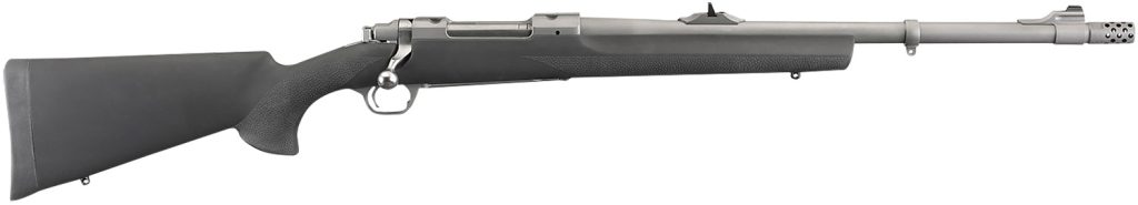 The Ruger Hawkeye Alaskan features a Hogue OverMolded stock molded from durable synthetic rubber that provides a soft, recoil-absorbing feel without affecting accuracy. Its cold hammer-forged barrel results in ultra-precise rifling that provides exceptional accuracy and longevity. The barrel also features a the Ruger Muzzle Brake System that includes a removable, radial-port muzzle brake that significantly reduces felt recoil. The non-rotating, Mauser-type controlled round feed extractor is among the most positive case extraction systems ever invented, and features a fixed blade-type ejector that positively ejects the empty cases as the bolt is moved fully rearward. The Hawkeye Alaskan also utilizes a hinged solid-steel floorplate, solid-steel receiver, LC6 trigger, three-position safety and a thread protector. Includes barrel band mounted swivel stud; optional forend swivel stud.
