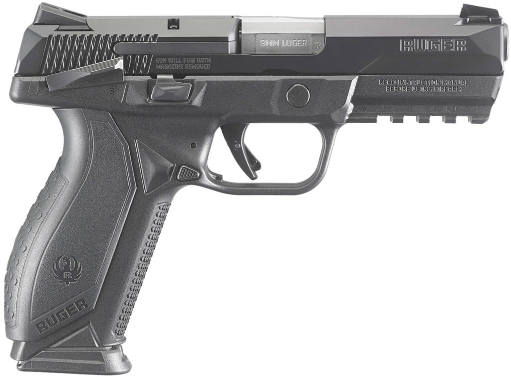 The Ruger American Pistol has a recoil-reducing barrel cam, low-mass slide, low center of gravity and low bore axis. The pre-tensioned striker system features a powerful striker spring for positive ignition without a heavier trigger pull. Its non-slip surfaces include functional slide serrations and grip/frame texturing for enhanced control. The American Pistol features a modular wraparound grip for adjusting palm swell and trigger reach to fit a wide range of hand sizes. Ergonomic grip modules lock in solidly and do not loosen. It has an ambidextrous slide stop and magazine release, Novak LoMount carry three-dot sights, MIL-STD-1913 Picatinny rail.Safety features include internal, automatic sear block system, ambidextrous manual safety and integrated trigger safety. Includes two nickel-Teflon plated steel magazines; small, medium and large grip modules.