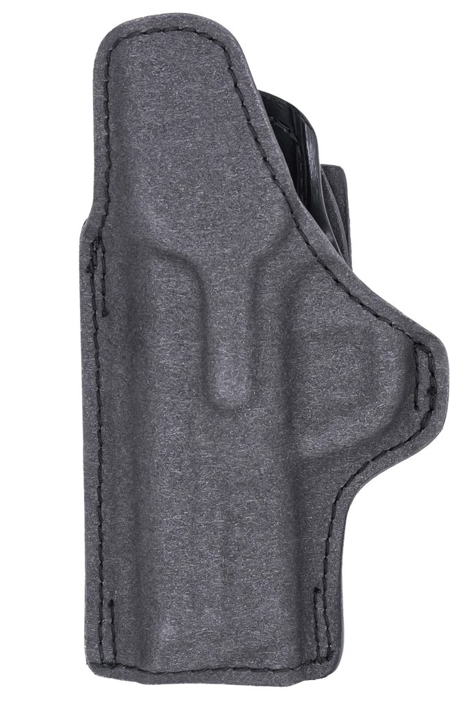 The Model 18 is an inside the waistband (IWB) holster constructed of firm SafariLaminate, allowing the holster to stay open after drawing, eliminating any fumbling while reholstering. It features a synthetic suede outer lining that grips clothing for less movement of holster. The open top design features a double snap belt loop that is adjustable for cant angle and fits both 1.25 in. (32 mm) and 1.5 in. (38 mm) belt widths.