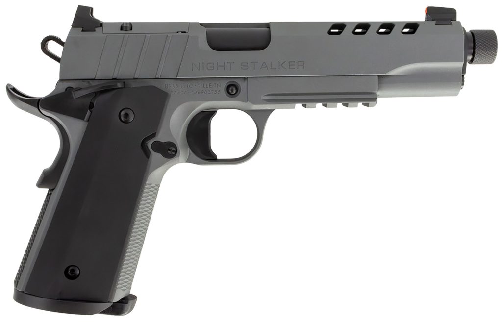 Tisas Night Stalker with steel frame features serrated slide w/cuts and a threaded barrel.