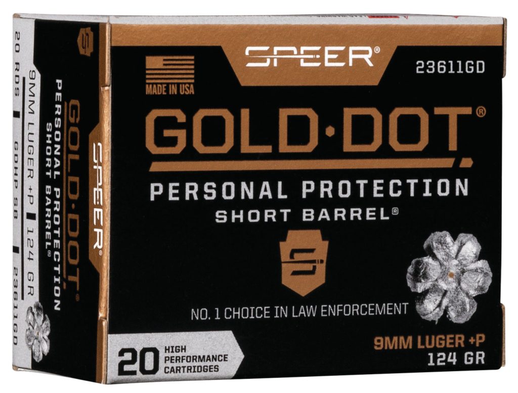 Speer 23611GD Gold Dot Personal Protection Short Barrel 9mmLuger+P 124gr Hollow Point 20 Per Box/10 Case