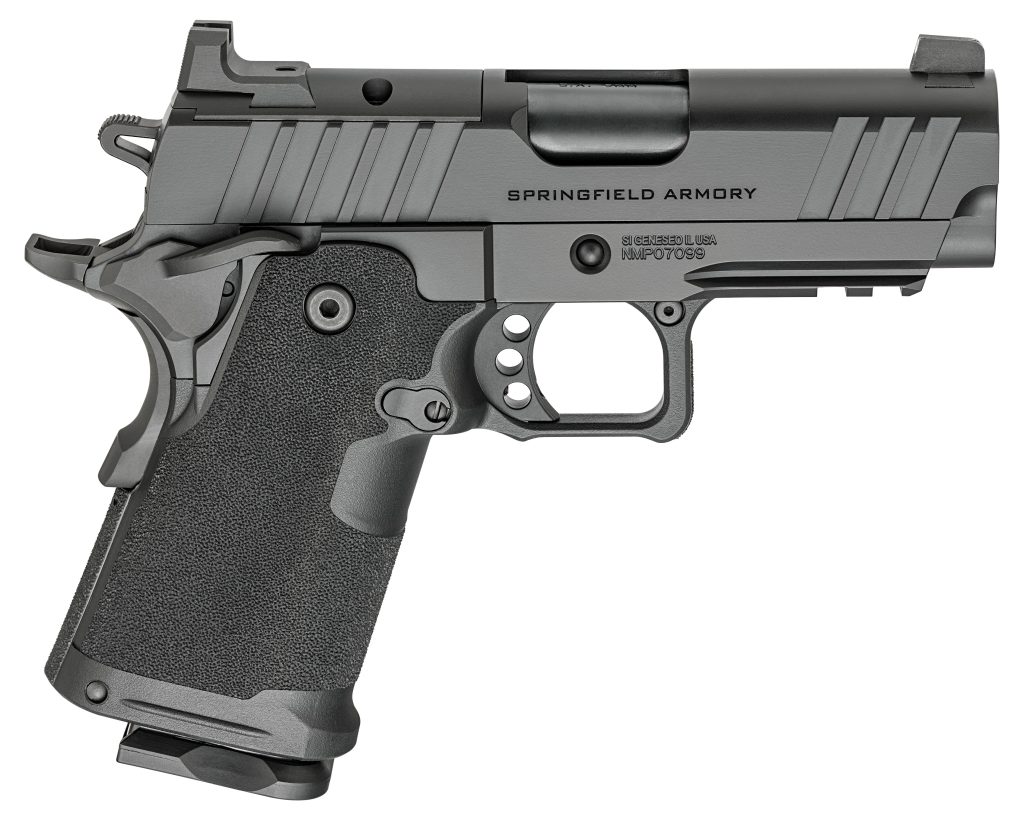 The Prodigy Compact from Springfield Armory® takes the proven 1911 platform and enhances it with double-stack capacity and a carry-focused feature set. Reconfigured around a 15-round double-stack magazine the Prodigy’s compact polymer grip module mounts to its lightweight aluminum frame to reduce weight while a shortened beavertail and recontoured hammer further downsize the overall footprint. Optics ready with a tritium front sight and and Picatinny rail the Prodigy Compact combines the most beloved characteristics of the 1911 with modern capacity for EDC. – Caliber 9mm – Color Black – Barrel 3.5 Forged Stainless Steel Black DLC Match Grade Bull 1:16 – Slide Forged Carbon Steel Black Cerakote® Optics-Ready – Frame Billet 7075-T6 Hardcoat Anodized Aluminum Black Cerakote® – Sights Tritium Front Black Serrated Rear – Recoil System Captured Guide Rod – Grips Polymer – Magazines (2) 15-Round – Weight 25.5 oz – Length 7 – Height 5.1