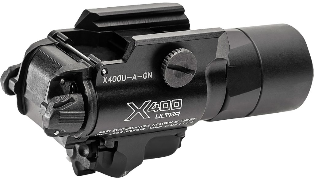 Pinpoint The Threat. The SureFire X400U-A-GN is engineered to fit virtually any rail-equipped pistol. Its recoil-proof LED and TIR lens focus 1,000 lumens of light into a smooth, far-reaching hybrid beam with a large central spot and plenty of spill light, an extremely effective combination for close- to medium-range engagements. Available in traditional red (635 nanometers) or high-vis green (515 nanometers), its 5-milliwatt laser is highly visible to the human eye to help the user get on target quickly and accurately. With a Mil-Spec hard-anodized aluminum body that’s light, strong and weatherproof, it can handle hard knocks and stay in the fight. Mounting an X400U-A-GN on your pistol or long gun is a clear sign that you take your security seriously.