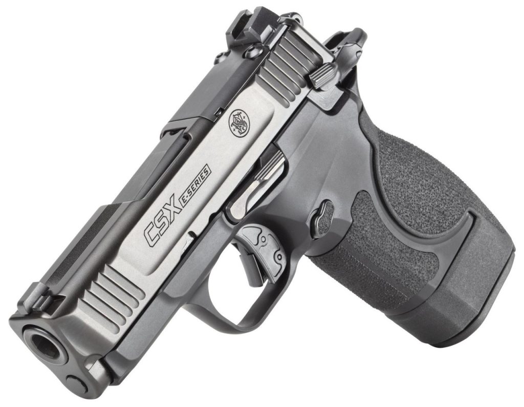 Introducing the new Smith & Wesson CSX E-series the next evolution in the CSX line. It boasts an enhanced E-Series trigger with a clean break and reset extensive grip texture coverage and a modular grip adapter that converts from micro-compact to compact frame size. This optic-ready pistol is chambered in 9MM with 12 15 or 17-round capacity options (magazines and adapters included) making it the advanced evolution of a classic platform perfect for those who demand more from their concealed carry. – MODULAR GRIP ADAPTER- The modular grip adapter lets you take your CSX and size to meet your needs. Size down for ultimate concealment or size up for better handling when shooting. – E-SERIES® TRIGGER- Newly enhanced E-series trigger that has a light clean break and an improved reset. The straighter pull to the rear aids in accuracy when firing. – OPTICS-READY- Modified RMS-C/507K optic footprint that features our ClearSight cut designed to strategically divert gasses away from your optic lens when firing. – 3.1 1:10 twist stainless steel barrel w/Armornite® finish. – Optic ready modified RMS-C/507K footprint. – White dot sights. – Aluminum alloy frame w/flat black finish. – Stainless steel slide w/Armornite® finish. – Interchangeable backstraps. – Ships with (one) 12-round (one) 15-round (one) 17-round magazines. – width 1.12 in – length 6.1 in – height 4.6 in – weight 19.7 oz – CALIBER 9MM – SIZE MICRO-COMPACT – CAPACITY 121517 – ACTION SINGLE ACTION – BARREL LENGTH 3.1 – GRIP POLYMER – SIGHTS WHITE DOT – OPTIC READY YES – SAFETY THUMB SAFETY – COLOR/FINISH BLACK – STATE COMPLIANCE DE – BARREL MATERIALSTAINLESS STEEL – FRAME ALUMINUM – NUMBER OF MAGAZINES 3