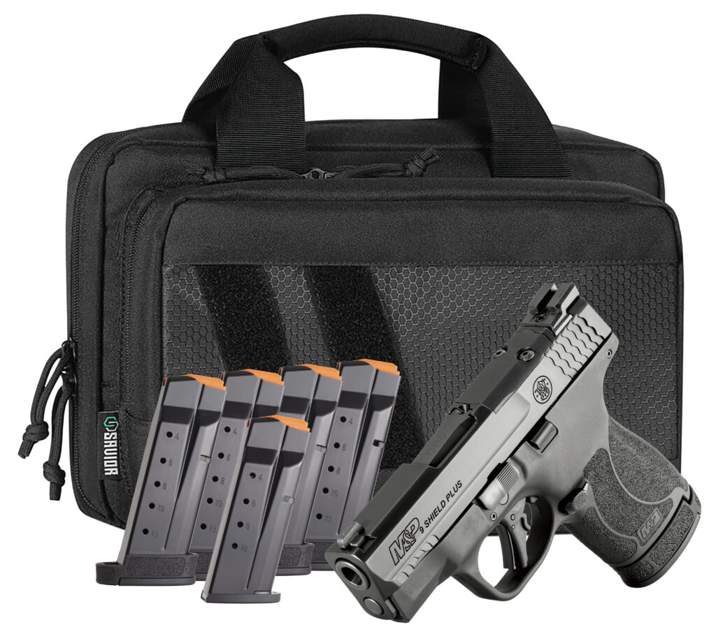 Bundle Includes: A M&P®9 Shield® Plus Pistol Six Magazines (total) and a Savior Equipment® Specialist Carry Bag With either the flush-fit 10-round magazine or the extended 13-round magazine the M&P®9 Shield® Plus is the next generation in everyday carry. It features an 18-degree grip angle for a more natural point of aim and better recoil management plus the new flat trigger allows for consistent finger placement for accurate repeatable and comfortable shooting. – Savior Equipment® Specialist Carry Bag- The Savior Equipment® Specialist bag with its unique front panel is designed and tested specifically for professionals. Features on this pistol case are tailored to hold all your range day accessories. – Model M&P®9 Shield® Plus -Carry On Bundle – Weight 19.9 oz. (564.2 g) unloaded – Rear Sight Night Sight – Grip Slim textured – Front Sight Night Sight – Width 1.1 (2.8 cm) – Barrel 3.1 (7.9 cm) Stainless steel with Armornite® finish – Overall Height 4.6 (11.7 cm) – Frame Size Micro-Compact – Slide Stainless steel with Armornite® finish – Overall Length 6.1 (15.5 cm) – Action Striker-fired semi-automatic – Frame Black Polymer – Sight Radius 5.3 (13.5 cm) – Rifling 1:10 Twist – Magazines Comes with Six Mags Total Five 13-round One 10-round