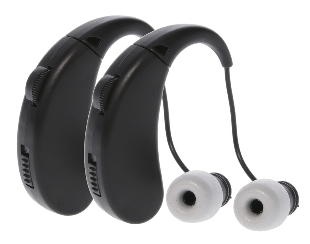 The Ultra Ear by Walker’s is rechargeable with a 48 hr battery life on a single charge. It has a lightweight, compact behind-the-ear design which can be used in either ear. Included are three sizes foam ear tips, three bottom cell batteries, and USB charging cord.