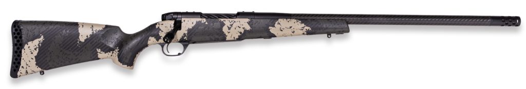 The Mark V® Backcountry Guide features Peak 44’s Blacktooth carbon fiber stock with Spartan Precision’s gunsmithing adapters factory installed. These adapters allow hunters to utilize Spartans ultra-lightweight accessories. Equipped with an Accubrake ST and 3DHex recoil pad the Backcountry Guide series manages recoil extremely well even with Weatherby’s historic magnum cartridges. The Guide series utilizes shorter BSF Carbon Fiber barrels making it easier to run suppressors and navigate in thick rugged terrain. – FINISH – Carbon Barrel- BSF Carbon Barrel – Receiver / Bolt / Bolt Knob / Safety- Graphite Black Cerakote – Stock- Peak 44 Blacktooth Exposed carbon fiber with olive green and backpack sponge pattern accents